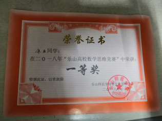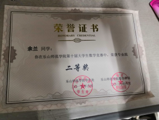 积极参加专业类竞赛,获得乐山高校数学思维竞赛一等奖,伟德BETVlCTOR1946数学竞赛二等奖。参加全国老员工数学竞赛的结果虽差强人意,但她会继续努力。