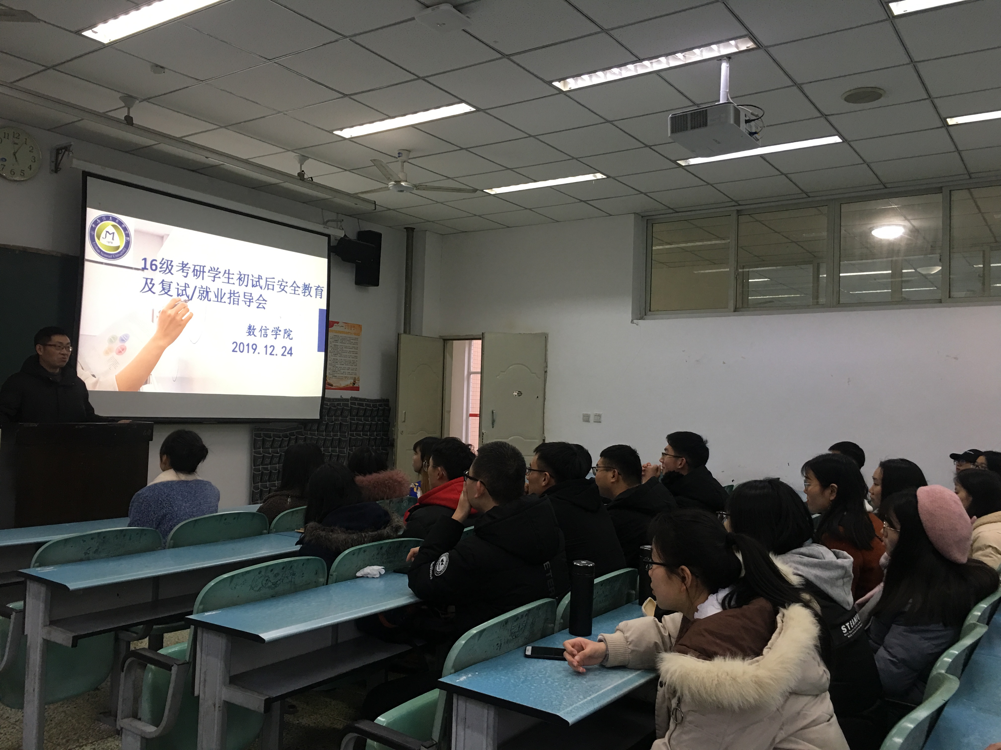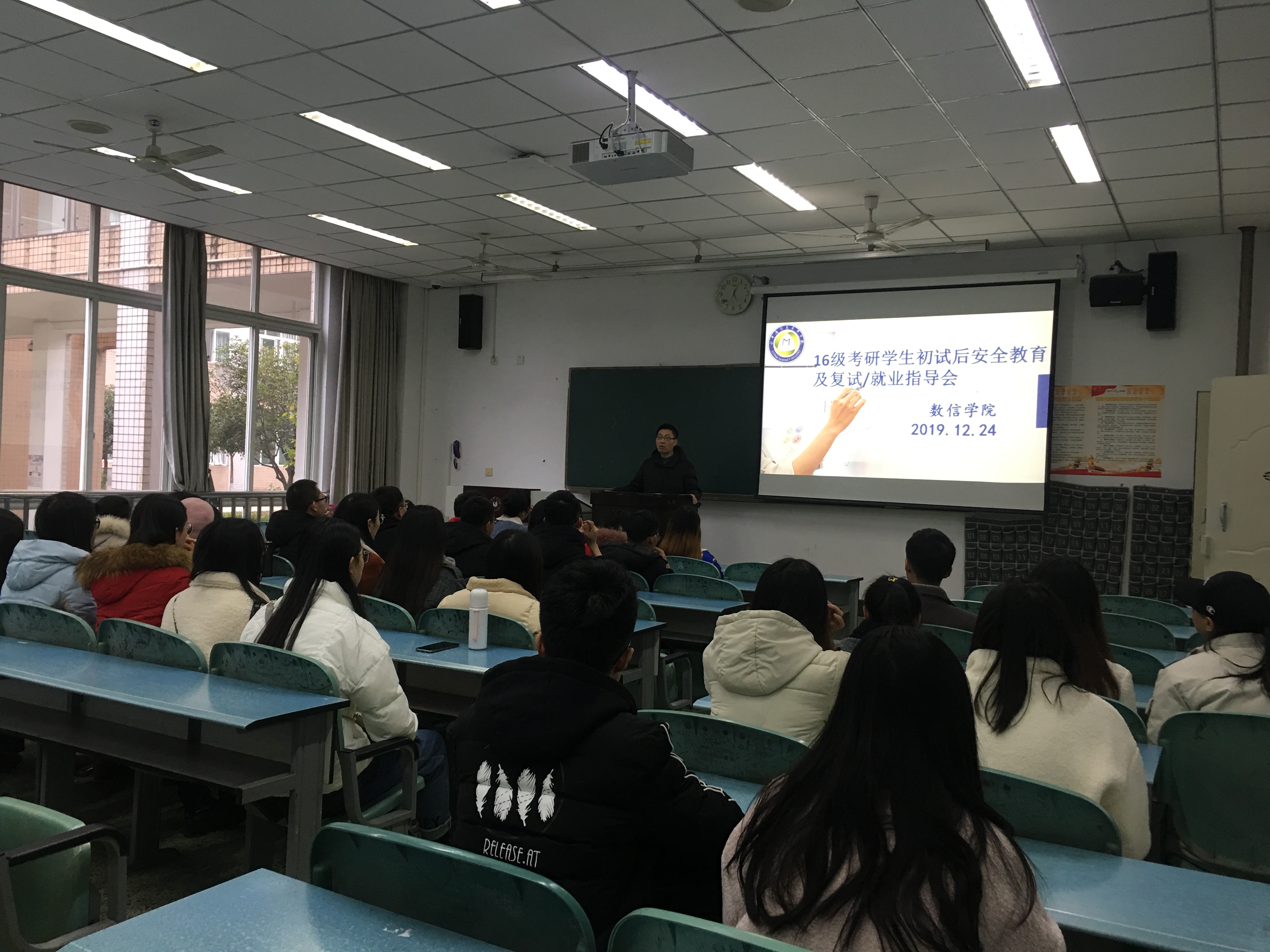 本网讯(图/文 江纳)2019年12月25日下午5:00,数信学院在行知楼110教室举办了一场16级考研员工初试后安全教育及复试/就业指导会。参与本次指导会的有特邀嘉宾李洪恒教授,辅导员江纳,以及16级考研员工。