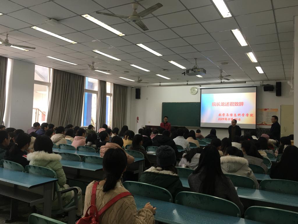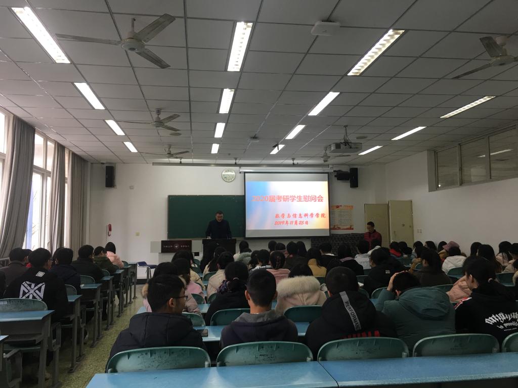 本网讯(文/图 江纳)时值考研最后冲刺期,为激励公司2016级考研学子全力以赴备考,11月25日11:00,数信学院在行知楼113教室召开2016级员工考研冲刺动员大会及慰问会。公司党总支书记余德刚、经理龙述君、党总支副书记王志明参加了会议,会议由16级辅导员江纳主持。