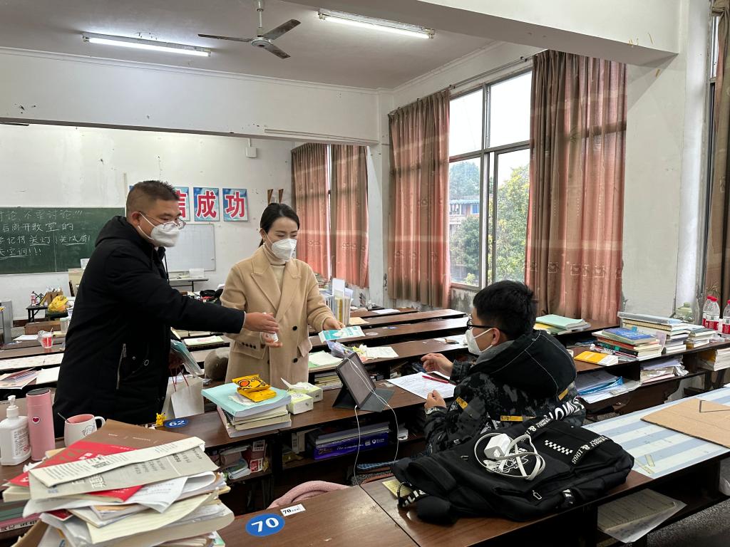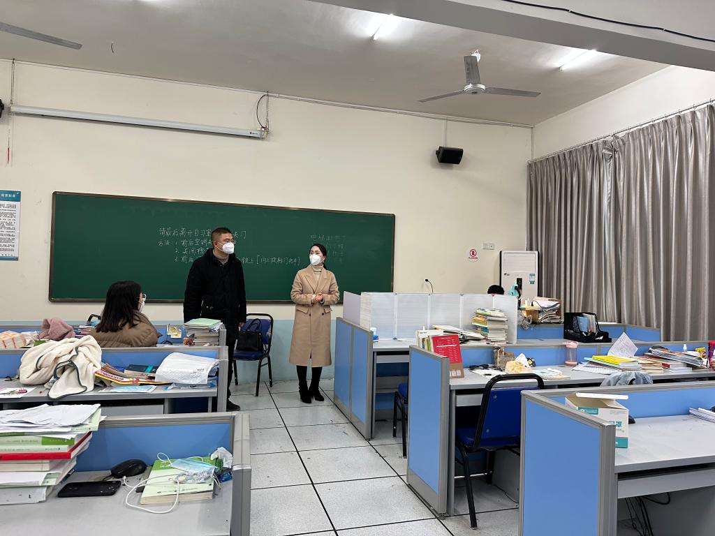在考研自习室里,左莉向考研学子们转达了公司领导班子的祝福和温馨提示,对同学们的身体状况、复习情况作了深入了解,并对部分同学近期出现的感冒症状进行了宽慰,希望同学们在接下来的几天里调整好身体状态和心态,以最佳的状态迎接研究生入学考试,祝愿同学们“一切真心不被辜负,一切努力终有收获。”辅导员陈盈舟、曹琳也与同学们进行了简短交流,关心同学们的科学防疫情况,叮嘱同学们一定要做自己健康的第一责任人,并送上了最真挚的鼓励与祝福。随后,老师们给考研学子分发消毒酒精、n95口罩等防疫物资,愿同学们能在最后几天加油冲刺,确保身体健康。