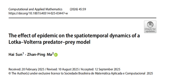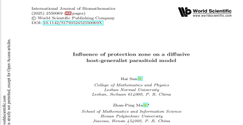 本网讯(文、图/樊华娜)近日,公司孙海教授与河南理工大学数学与信息科学学院马战平博士合作的两篇论文分别刊登在《International Journal of Biomathematics》(中科院二区),《Computational and Applied Mathematics》(中科院三区),公司为第一单位。两篇论文均聚焦非线性偏微分方程中的反应扩散模型展开研究。